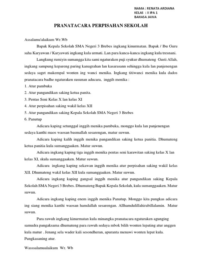 Pidato perpisahan ini kami tuliskan untuk sahabat yang sedang mencari pidato perpisahan sekolah yang nantinya akan dibawakan pada saat acara perpisahan sekolah dengan menggunakan bahasa jawa. Jun 19, 2013 · contoh pranatacara perpisahan pranatacara perp i sahan sma n 1 wates assalamu 'alaikum wr. Bapa / ibu guru saha karyawan / karyawati ingkang kula urmati. Mar 03, 2015 · bahasa yang biasa digunakan oleh orang jawa tengah. Yang aku pos kali ini adalah pranata cara perpisahan.