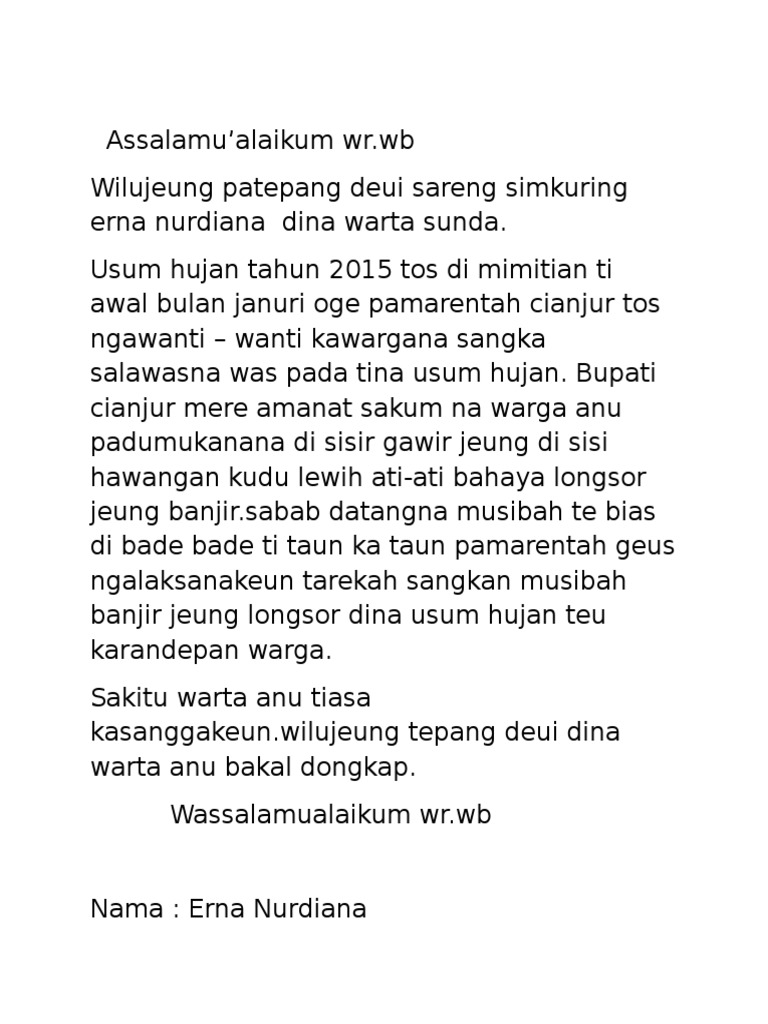 Sumber Naskah Warta Berita Basa Sunda from imgv2-2-f.scribdassets.com Contoh pidato bahasa sunda singkat tentang pendidikan, kebersihan, perpisahan, kesehatan, lingkungan, narkoba, kemerdekaan, pemuda, agama, dll. Berisi contoh teks persuasi singkat tentang pendidikan, kesehatan, lingkungan, lengkap. Assalamualaikum wr wb terimakasih sudah berkunjung ke halaman blog ini. Biasanya, esai dimuat di media massa cetak. Hai sobat semua, kali ini saya akan membagikan artikel bahasa sunda. Salah satu cara mengajak masyarakat untuk hidup sehat yaitu dengan pidato tentang kesehatan. Contoh teks eksposisi beserta strukturnya tentang kesehatan. Di sini memang sengaja disajikan hanya pidato singkat.