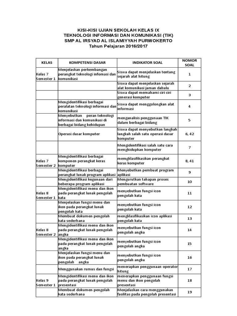 Dengan tujuan ntuk menjaga agar tes yang kita susun tidak menyimpang dari bahan (materi) secara aspek kejiwaan (tingkah laku) yang akan dicakup dalam tes. Tugas tik dikumpul pada saat jadwal uas tik. Nov 18, 2013 · jadi gini nih ada tugas tik (cihuy!) dan diminta buat kisi kisi nah daripada basa basi gak jelas , mending off to the topic. 24 november 2017 / nur alamsyah nurdin. Istilah internet merupakan singkatan dari. Internet pada awalnya disebut dengan. Simpan simpan kisi soal tik kelas 9 semester ganjil untuk nanti. Kisi kisi uas tik kelas x xi dan xii semester ganjil 2012 inilah pembahasan lengkap terkait kisi kisi uas tik kelas 9 2019. Istilah internet muncul sekitar tahun 1983. 93% (81) 93% menganggap dokumen ini bermanfaat (81 suara) 19k tayangan 8 halaman. Upgrade and get a lot more done! Ix (sembilan) / 1 alokasi waktu jumlah soal bentuk soal master soal penyusun : Written by kang didik on kamis, 12 maret 2015 | kamis, maret 12, 2015.